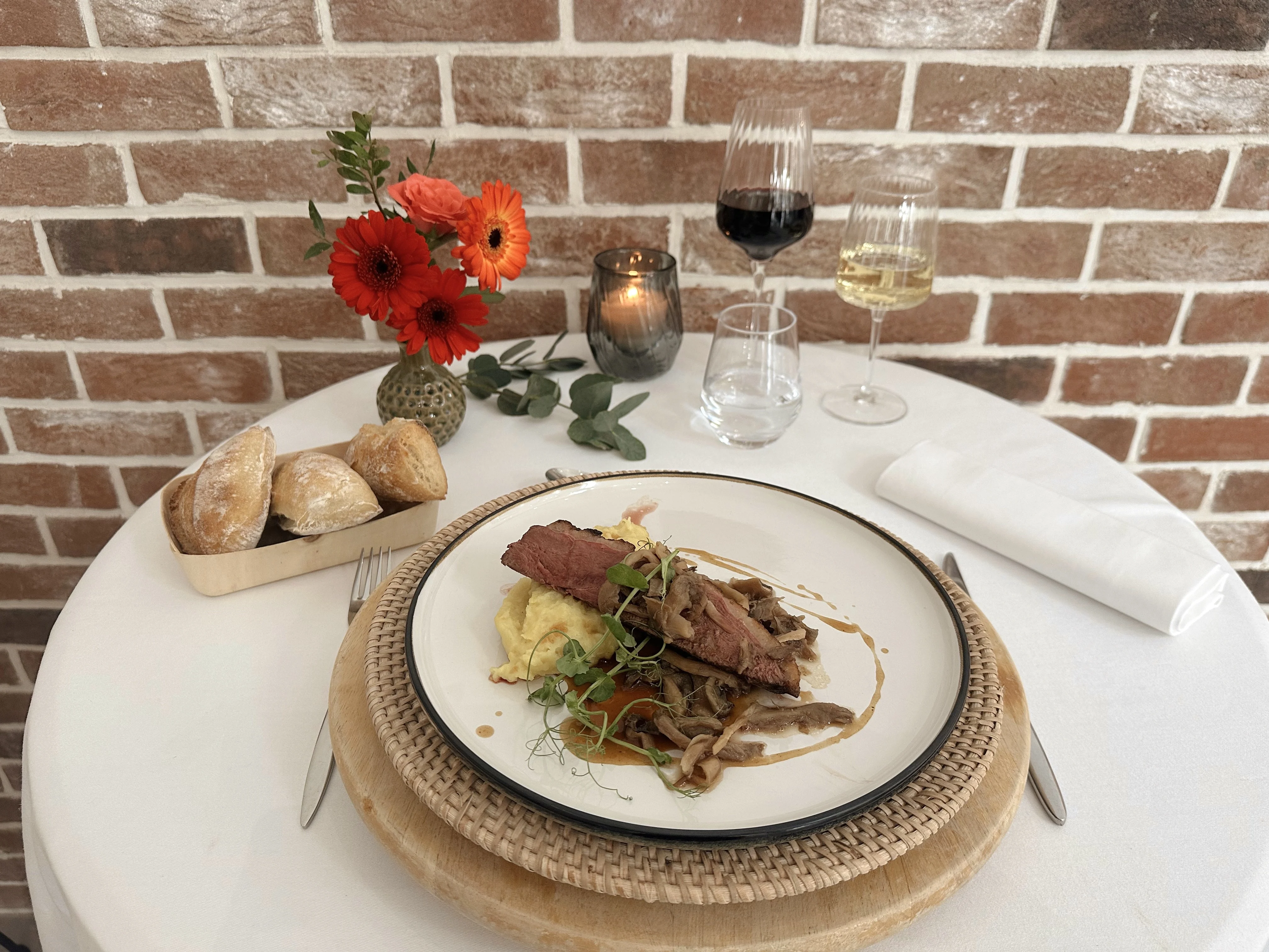 Tronçon de magret de canard, pomme de terre à l’huile fumée, pleurotes, jus à l’estragon